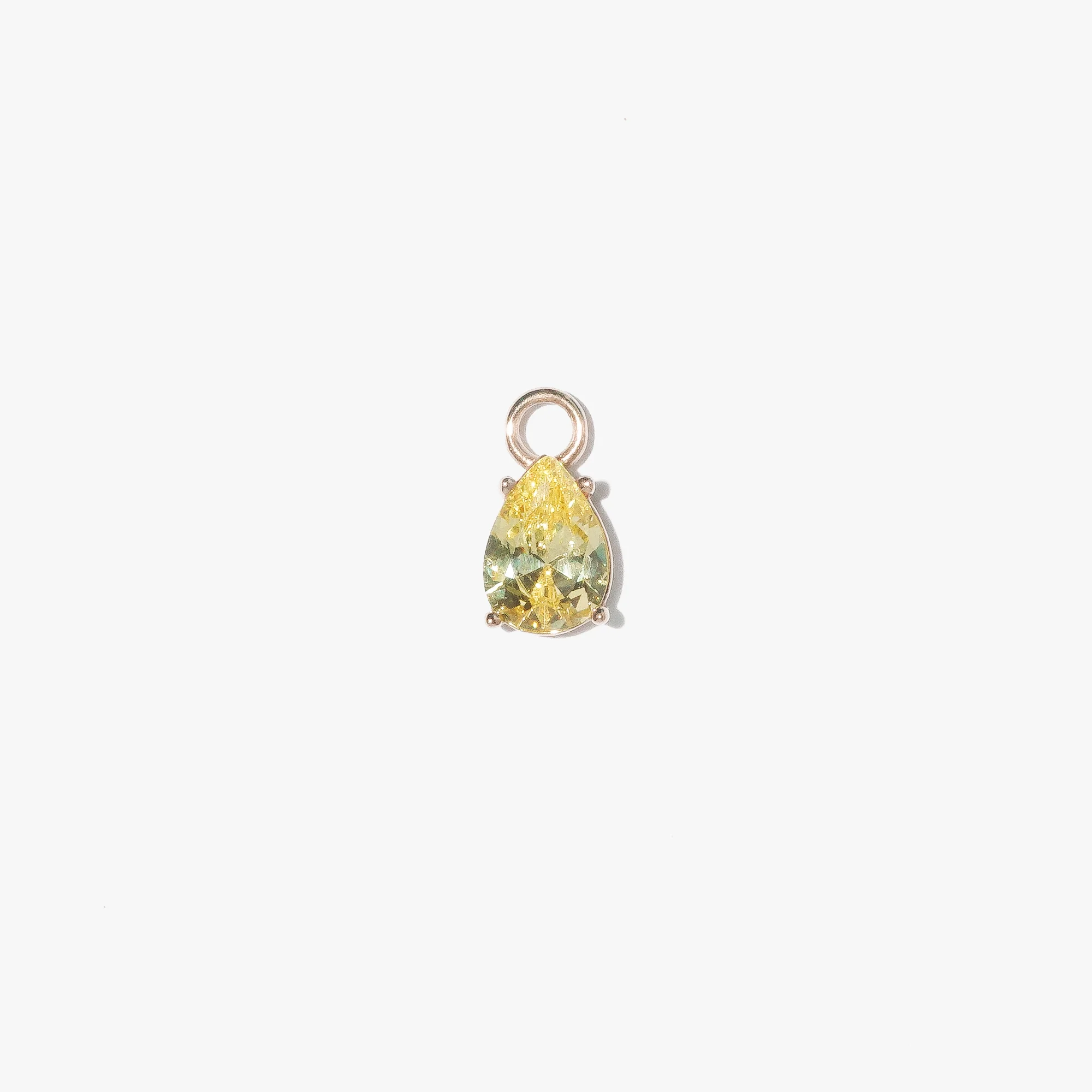 A sparkling, pear shaped yellow diamante CZ gem drop to pair with our fitting hoops. Each 5A quality CZ stone is hand set. Sold as a single. Please see Earring Charm Fit Guide in pictures to see which accompanying hoops will fit. Please Note: Earring Charms are Final Sale.